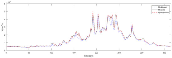 To compare the Muskingum method and hydrodynamic model, we used the measured hydrological data from 2005. This is because construction of the Three Gorges Dam was finished in 2006. After the dam was finished, the hydrological station in front of the dam could not measure flow in the river. Similarly, the year the dam was nearly finished also had an impact on the river. Thus, we can use the data from 2005 to compare the differences between the two methods.