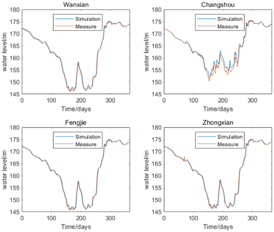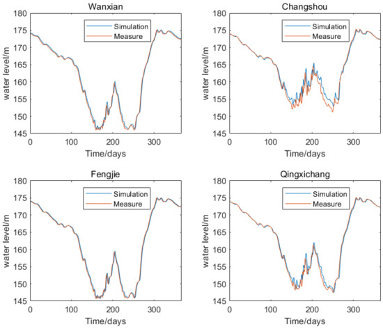 As can be seen in Figure 6, the closer the hydrological station is to the Three Gorges Dam, the more accurate the simulation results. It can be seen from Table 1 that the relative error for Changshou hydrological station is the largest, reaching 0.5%. It can be seen in Figure 4 that Changshou hydrological station is located at the tail of the Three Gorges Reservoir area. Changshou hydrological station is affected by the dynamic capacity during the flood season, and its water level fluctuates greatly. It can be seen in Figure 6 that the error is more obvious during the flood season, whereas the simulated and measured values are in good agreement during the non-flood season. This is because the manning coefficient differs with the different water levels at Changshou hydrological station, which affects the simulation results. It can be seen from Table 1 that the minimum relative error for the four stations is 0. This is because the Three Gorges Reservoir continues to operate at a water level of 175 m during the dry season and the flow velocity in the entire reservoir area is slow, so the relative error is very small. The calibration results for the Manning coefficient are shown in Table 2.