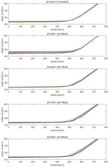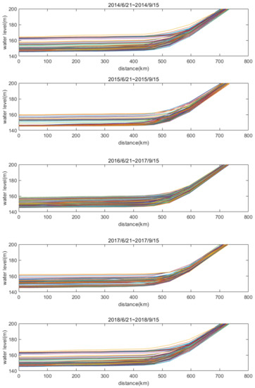 Using measured data from 2014 to 2018, changes in the water surface profile for the Three Gorges Reservoir during the flood season are shown in Figure 8 and Figure 9.