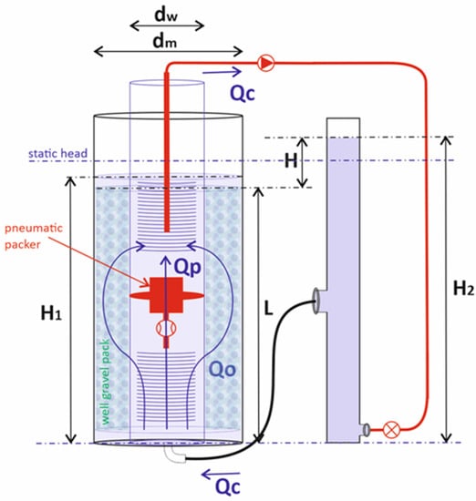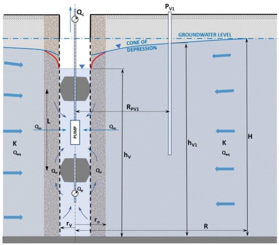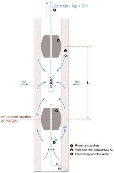 The only unknown in Equation (2) is the Qin inflow from the aquifer through the height L (Figure 2). There are two possible ways to determine this inflow. First, it can be measured using a borehole dilution technique []. For this purpose, resistivity logging is used. The mineralization of water in the extraction well is increased by diluting NaCl. The inflowing groundwater differs in electrical resistivity from the water in the extraction well. By repeatedly measuring the electrical resistivity of the water in the extraction well using resistivity logging, it is possible to quantify the horizontal inflows to the well at different depth levels.