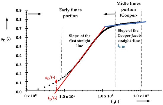 where Q is the pumped amount of water (m3/s), s* is the drawdown at the point of intersection between the “first straight line” segment with the time axis (m) (see Figure 3), and T is the aquifer transmissivity (m2/s).