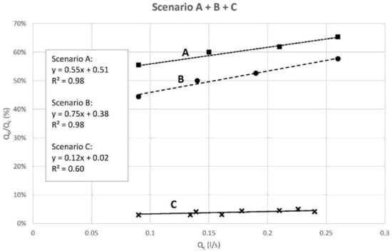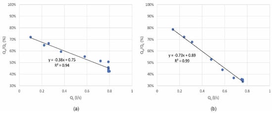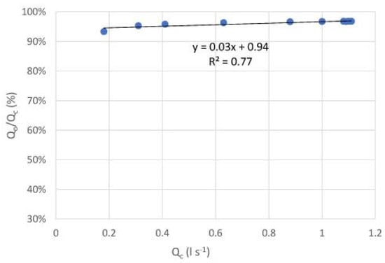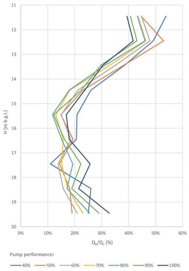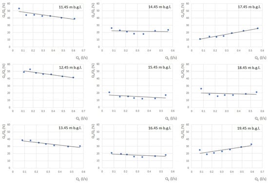 After inserting these values into Equations (4) and (5), the value Qin = 0.0047 l/s was obtained. Because the changes in Qin were minimal compared to the changes in the total pumped flow Qc, the same values of Qin for all pumped flows Qc were considered for simplification at a given measured depth.