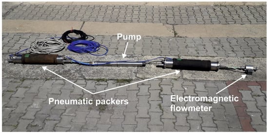 - Two pneumatic packers to seal the measured section of the extraction well. A through-flow pipe passes through the center of the packers. The packer’s bodies can accommodate three independent cables sealed at the flanges using watertight bushings. In the case of the INV-FLOW apparatus, these cables are used for (i) the electrical connection of the pump, (ii) the supply of compressed air for controlling the packers, and (iii) the electrical signal from the electromagnetic flowmeter.