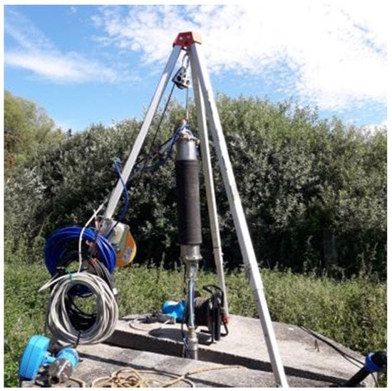 The measurement record at two depth levels of the HJ-3 extraction well is shown in Table 8 and Table 9 and Figure 10. In this case, the contribution of groundwater to the surrounding environment of the aquifer was assumed to be zero (Qin = 0.0 l/s) because the HJ-3 extraction well showed a high degree of clogging in the measured sections, as confirmed both by the geophysical logging and the camera inspections []. With the increasing pumping flow rate Qc, a rapid decrease in water flow around the pneumatic packer through the gravel pack can be seen. At the measurement depth of 11.75 m b.g.l., 40–50% of the pumped water flowed through the gravel pack at the maximum pumped flow rate. At the depth of 15.75 m b.g.l., only 30–40% of the pumped water flowed through the gravel pack. Thus, it is evident that clogging contributed significantly to the limited water flow through the gravel pack. The INV-FLOW apparatus during the pilot testing on the HJ-3 extraction well is shown in Figure 11.
