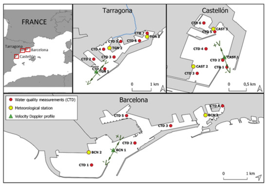 Meteorological and sea-level data were recorded by meteorological stations equipped with a tidal gauge, located in the central area of the harbours. All the time series had a sampling interval of 10 min. At the beginning and the end of each campaign, vertical profiles of water quality parameters, temperature, and salinity were measured at several locations in the harbour, using a SeaBird 19 plus CTD sensor (Sea-Bird Electronics, Bellevue, WA, USA), registering data every 0.25 m. Because of technical issues, the CTD profiles were not acquired at the beginning of the Barcelona harbour campaign, being replaced by one of the CTD regular profiling campaigns carried out bimonthly by the harbour authority.