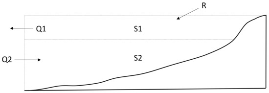 Application of the box model requires separating the harbour water into boxes (upper and lower in this case), defined from the registered Doppler current profiles and the depth at which the mean current changes direction (example diagram in Figure 2). This approach was well suited to the Tarragona and Castellon harbours because the dominant circulation pattern can be classified as estuarine positive. Once the boxes have been defined, the salinity data from the CTD campaigns are used to estimate the average salinity per box, defining surface freshwater inputs from available (climatic) information. This analysis obtained a mass balance for water and salt, using Equations (1) and (2), based on the days on which CTD campaigns were carried out.
