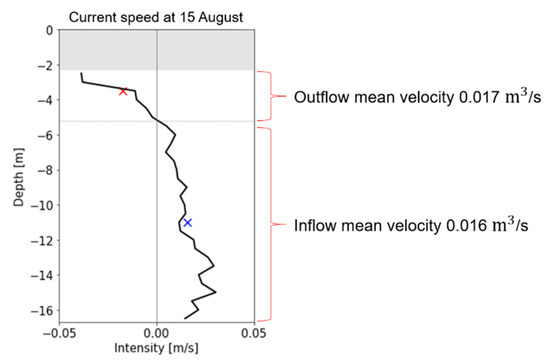The second method used to estimate RT and the associated in and outflows, was based on the daily averages of the Doppler data [39]. The daily-averaged current profiles were then analysed to determine the depth at which the flow changes direction, defining again an inflow and an outflow layer. By multiplying the mean velocity by the section of each layer at the harbour mouth, the total water inflow and outflow through the harbour entrance was estimated. An example of that applied procedure is shown in Figure 3. In the particular case of Barcelona’s harbour, where only one Doppler was operative near the main southern mouth, the flow of the northern entrance was calculated from a mass balance considering the freshwater input from land and the flows calculated for the southern mouth. The obtained results were compared with those obtained from the box model, which provided a more robust estimation of flows and RTs for the Barcelona harbour.
