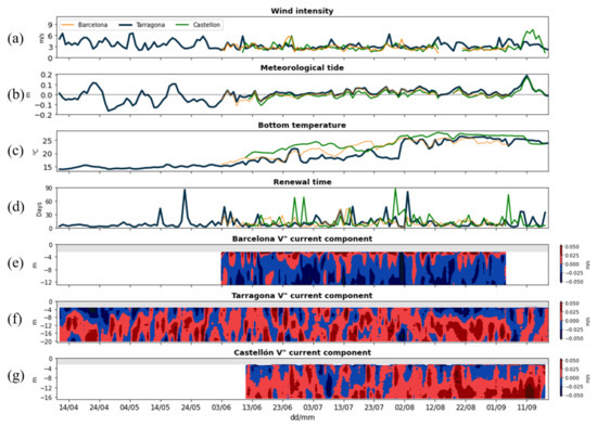 Time series (24 h filtered) of meteocean drivers from wind and tidal observations at Barcelona, Tarragona, and Castellón harbours, together with some of the more relevant circulation responses. From top to bottom: (a) wind speed, (b) meteorological tide, (c) bottom temperature, (d) renewal time and (e–g) v-component of the current velocity.