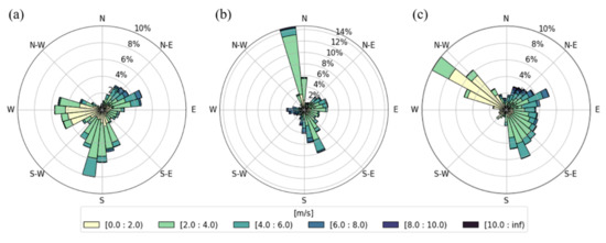 Wind rose diagrams from Barcelona (a), Tarragona (b), and Castellón (c) harbours. Concentric circles represent the percentage of occurrence, colours denote wind speeds in metres per second, and directions are “winds coming from”.