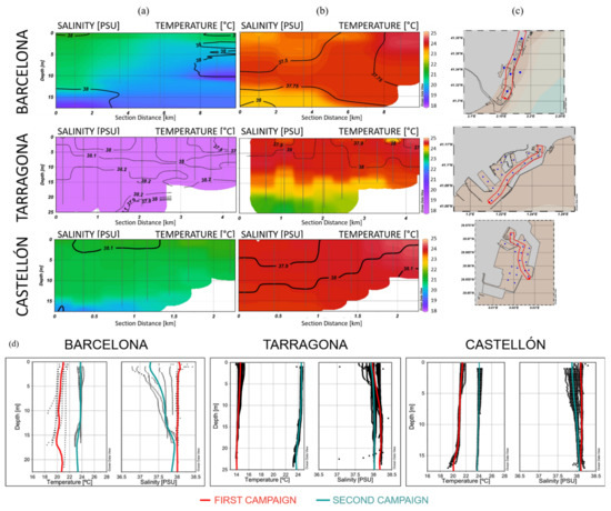 Temperature (°C) and salinity (PSU) sections (columns (a) and (b)) and profiles in Barcelona, Tarragona, and Castellón harbours (line d). In the presented sections, the colour bar shows temperature values and black lines show salinity values. Profiles in red correspond to the average of the first campaign’s data, while profiles in blue correspond to the average of the last campaign’s data. (c) is the location of the analysed section.
