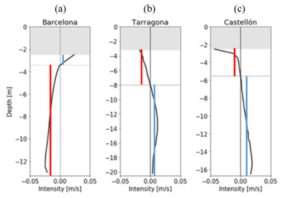 The current velocity profiles (Figure 7), derived from the averaged velocities in each measurement layer, showed a two-layer circulation in all three cases, which was persistent during the whole study period. In Barcelona (Figure 7a), a surface layer of approximately 4 m was observed flowing towards the northern part of the harbour (positive values), with a thicker, deep layer flowing towards the southern basin (negative values). In contrast, in Tarragona and Castellón (Figure 7b,c), the opposite distribution was observed, with surface currents flowing out of the harbour and seawater entering through the deeper layers. Because of the small intensity of the observed currents, only averaged values have been presented, since they are the only ones suitable for further comparisons and cross-calibration.