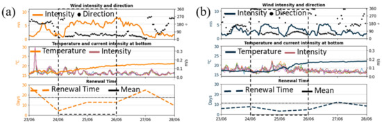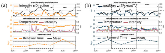 As can be seen in Figure 11, in all cases the renewal times presented high variability for Mediterranean microtidal conditions. This figure shows a comparison between the renewal times estimated by the box model (colour points) at the beginning and at the end of the field campaigns and those calculated from the measures’ (Doppler current meter) velocities (coloured lines).