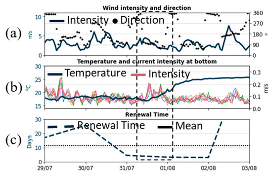 Detailed evolution of the third episode of abrupt temperature increases in Tarragona harbour. Line (a) wind intensity (solid line) and wind direction (black dots). Line (b) temperature (thick line) and current speed near the seabed (the thin coloured lines represent the intensity in the deeper layers). Line (c) turnover times (the black line is the average turnover time of the harbour). The dashed black squares correspond to the day of downwelling.