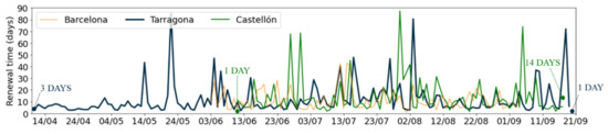 Sample time series of renewal times (in days) for Barcelona (orange line), Tarragona (blue line), and Castellón (green line) harbours, estimated by box models and from the recorded velocity data.