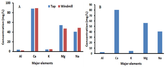 The mean major metal concentrations were found to be generally in the order of Ca > Mg > Na > K > Al in both the tap and windmill water samples as seen in Figure 1. However, it should be noted that Na (48.7 mg L−1) was slightly more concentrated than Mg (46.9 mg L−1) in the windmill water during the dry season. The water contains elevated levels of Ca, Mg and Na, with the windmill water sample containing the highest concentration of Ca at 89.0 mg L−1. Calcium and magnesium are reportedly the principal sources of water hardness [15]. The presence of Mg and Ca in groundwater from the current study can be attributed to the hydrogeochemical removal of these elements from carbonate-rich rocks [27,29]. Rocks rich in carbonates have been reported to include sedimentary rocks such as limestone [15]. Aluminium, manganese and zinc have also been reported as sources of water hardness [15] and all are present in the drinking water of the current study. Aluminium and potassium were the major metals with the lowest concentrations in drinking water, however, Al levels still exceeded the limit set by WHO in drinking water [26]. The results obtained from the analysis of major elements have shown that the salinity of the water samples increases during the dry season and is low during the wet season. The reason for the difference between the two sampling seasons can be attributed to evaporation and less dilution of saline ground inputs [11] as there is less rain during the dry season which consequently results in higher salinity and high concentration of major elements such as Ca and Al during the dry season.