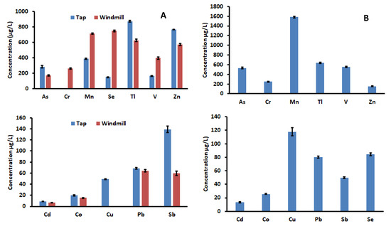 Metal concentrations (µg L−1) of trace elements in tap and windmill water samples collected in (A) dry and (B) wet seasons.