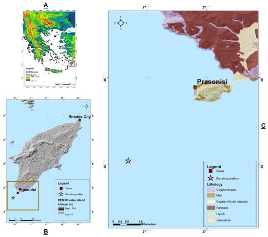 Location map: (A) location of Rhodes Island in Greece, (B) location of the study area in Rhodes Island, (C) detailed geographic information of the study area, along with the sampling position. Topographic data gathered from National Cadastre and lithological formations extracted from the geological map of Rhodes, Sheet “Rhodes” [25]. Figure created in Arcmap 10.7.1.