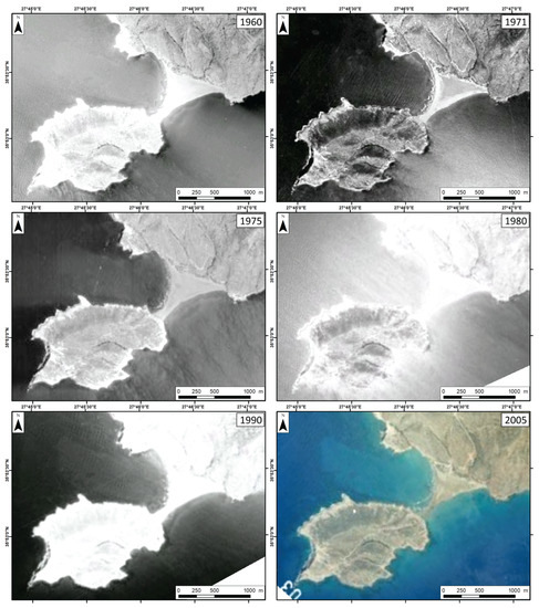 Aerial photos showing the changeable shape of Prasonisi’s tombolo [24]. Figure created in ArcGIS.