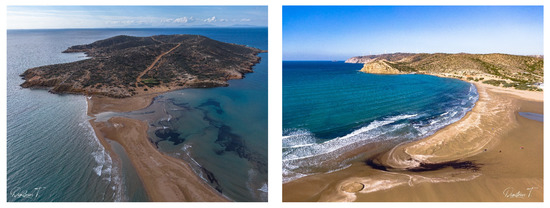 The tombolo is a relatively large (c. 750 m in length along its longitudinal axis and c. 850 m in width along its maximum lateral axis) delta-shaped tombolo composed of medium sand. However, its shape is constantly changing, as evidenced by a series of available aerial photographs and satellite imagery since 1960 (Figure 2) and recent photographs (Figure 3). Sometimes, the morphological changes are so severe that the tombolo is cut off from the islet, forming a salient. The salient can be maintained for a period of a few months to a few years, switching afterwards to a tombolo again as a result of coastal morphodynamics. This changeable landform seems to adapt its shape to the dominant wave regime, since the tidal range is very low (a few tens of centimeters) [26]. It is quite possible that during the constructive periods, sediment being transported from the nearshore zone to the beach nourishes and feeds the tombolo, while during the destructive periods, sediment moves in the opposite direction to the sea building or expands submerged longitudinal sandbar.
