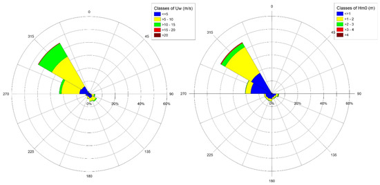 The prevailing winds come from the WNW direction and usually have an intensity of 7–21 knots (for 60% of the winds), while waves usually come from the NW direction, having an average significant wave height of about 1 m. Although the frequency of E, S, and SE winds and waves is very low, these wind and wave conditions are relatively strong [27] (see Figure 4).
