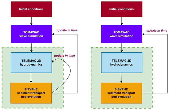 Schematic coupling of the three modules to simulate waves, currents, and sea bottom evolution for different coupling periods (left) and for identical coupling periods between the modules (right).