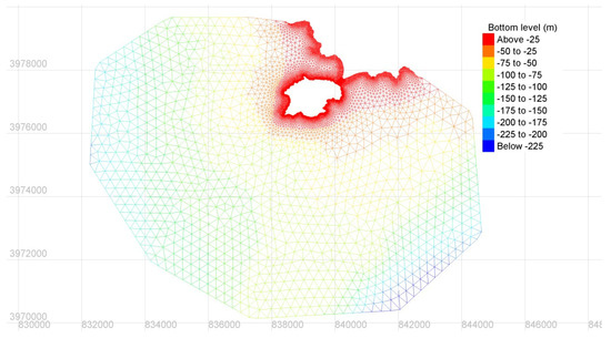Bathymetry and coastline information in the study area have been provided by the Hellenic Navy Hydrographic Service (https://www.hnhs.gr/ (accessed on 1 March 2021)). The model domain (Figure 6), including both the coastline and an area of open sea, was represented using a triangular unstructured finite element grid. A high resolution (5–20 m) mesh was applied within the area of the tombolo and also in the surf zone to allow high resolution of the significant bathymetric features, while a coarser grid resolution (up to 250 m) was applied offshore to reduce computational cost. Additionally, a filled contour map of the bathymetry in the intermediate and shallow water area is presented in Figure 7. These data of the study area will be used as the initial bathymetry for all simulated wave scenarios. As we can see in Figure 6 and Figure 7, the narrow area between Prasonisi and Rhodes Island is of the salient type.
