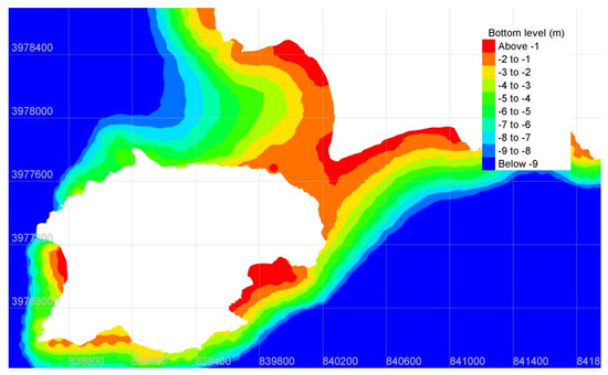 Filled contour map of the bottom level information in the intermediate and shallow water area of interest. Map created in Blue Kenue™ software tool for hydraulic modellers.