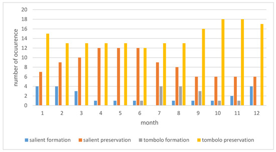 Regarding the other states of morphology, they are observed in all months, though the rate of salient preservation during the year was different from the corresponding trend of tombolo preservation. In particular, the relative frequency of tombolo preservation is 55.4% and the relative frequency of the salient one is 32.8%. Hence, although tombolo formation covered a lower time period than salient formation, tombolo preservation had a higher duration than salient preservation.