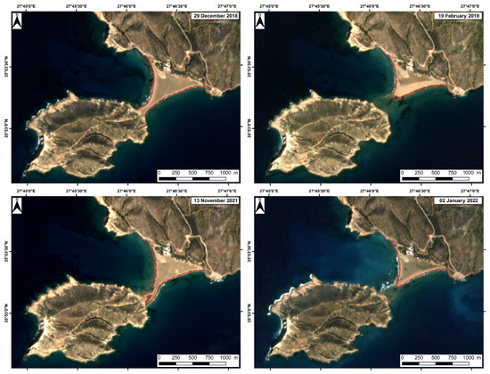 The morphological changes of the tombolo were based on the analysis of free access Landsat satellite images (TM: Thematic Mapper, ETM+: Enhanced Thematic Mapper Plus and OLI: Operational Land Imager) acquired over the period 1995–2021, with an 8-day or 16-day repeat cycle and a spatial resolution of 15 m or 30 m. The Landsat imagery was downloaded in GeoTIFF format from the United States Geological Survey (USGS) Earth Explorer Website (http://earthexplorer.usgs.gov/ (accessed on 15 February 2021)). In addition, Sentinel-2 Level-2A multispectral images were taken between 2017 and 2021 with a 10-day repeat cycle and a spatial resolution of 10 m. The Sentinel-2 imagery was downloaded from the European Space Agency website (https://scihub.copernicus.eu/ (accessed on 15 February 2021)). After the necessary corrections, the shoreline was automatically extracted from the available satellite imagery after applying the Normalized Difference Water Index (NDWI).