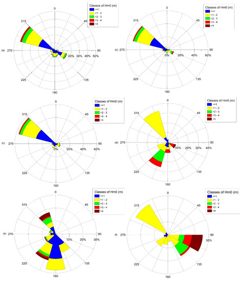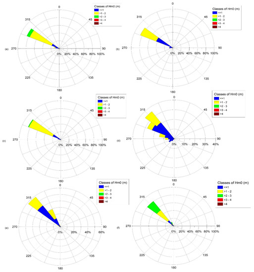 Rose diagram of offshore Hm0 corresponding to time periods of tombolo formation, i.e., (a) 3_tf, (b) 7_tf, (c) 11_tf, (d) 19_tf, (e) 23_tf, and (f) 27_tf (for symbols see Table 2). Figure created in Grapher 9.