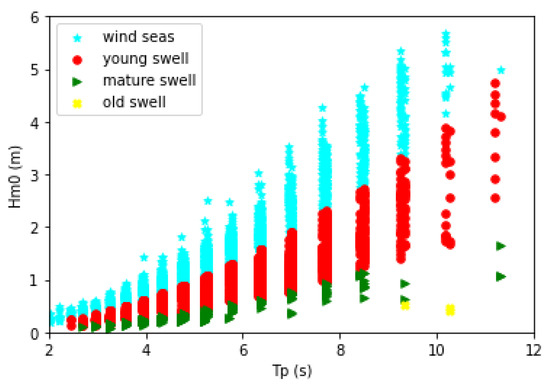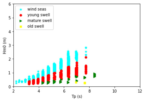 Initially, the swell criterion is applied to the datasets, based on the Thompson et al., [32] classification to discriminate swell seas from wind seas. This criterion is implemented because the two wave types have distinct characteristics [33], which in turn produce different effects upon the sea bottom and the beach profile. Wind seas usually have an offshore peak wave steepness higher than 0.025. This steepness is defined as the ratio of offshore spectral significant wave height (Hm0) and wave length Lp, based on peak wave period Tp. The swell steepness diminishes as the wave moves away from the fetch region [34]. Swell seas with steepness values of 0.010–0.025, 0.004–0.010, and <0.004 are classified as young, mature, and old, respectively.