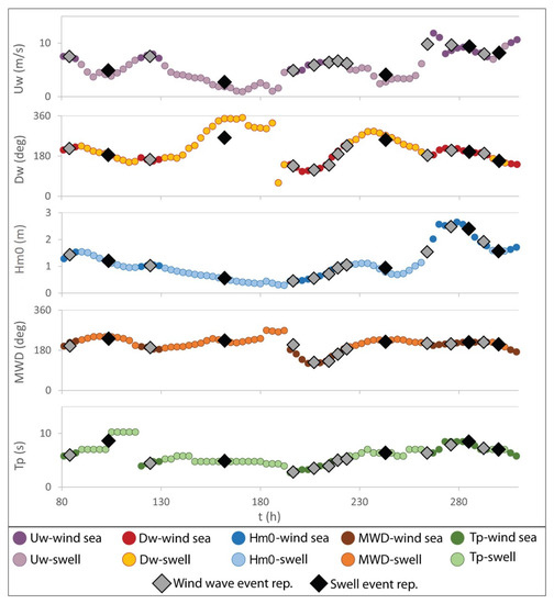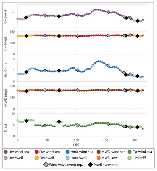 It is noted that this methodology differs from wave climate schematization techniques, e.g., [42,43], that are appropriate for long-term morphological simulations (≥1 yr) aiming to assess the potential sediment transport over a long time period. However, a similar approach to the long-term wave climate schematization techniques could also be performed by using the method mentioned above, via grouping of the wind-wave events and swell events.
