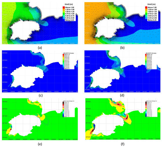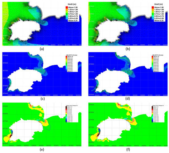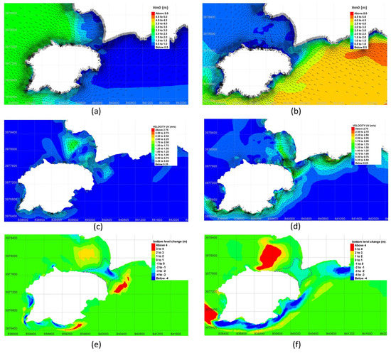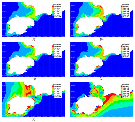 Additionally, as in the present case when a submerged sandbar is located in shallow waters between the mainland and the tied island, waves traveling from offshore towards the sandbar undergo increasing bottom effects (e.g., shoaling, refraction, breaking, diffraction, etc.). However, when they pass the sandbar, the water depth is increased again, which could lead to decreasing bottom effects downstream of the submerged sandbar. The bottom complexity in this zone under certain wave conditions, and mainly when wave breaking takes place and as a consequence the flow becomes extremely turbulent, could cause the presence of the surf zone upstream and downstream of the sandbar. This phenomenon enhances the sea bottom’s morphological changes in this region. This is observed in wave scenarios two, four, and six (see Figure 19b,d,f), respectively. Moreover, it is observed that a breaker index greater than 0.6 results in sand accretion (e.g., Figure 19b) or erosion (Figure 19d,f) to a greater degree than in cases of values lower than 0.6.