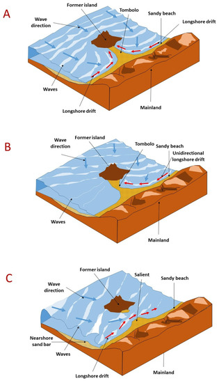 Description of (A) the general case of tombolo formation by longshore drift from the two sides of the tombolo, (B) another case of tombolo formation by a unidirectional longshore drift, and (C) the case of salient formation by extreme wave conditions.