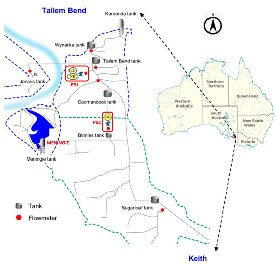 The Tailem Bend-Keith (TBK) drinking water distribution system is one of the largest WDS located in the Tailem Bend township in South Australia. The TBK system extends from the Tailem Bend to Keith communities, consisting of about 130 km long pipeline which feeds about 800 km of branch mains [14,29]. It serves a large area of about 6500 square km, supplying drinking water to customers in Meningie, Karoonda, Keith, and other smaller townships (Figure 1). The water treatment plant (WTP) is located at Tailem Bend and the source water is drawn from the River Murray. Prior to the delivery of treated water to the TBK distribution system, the raw water goes through several stages of treatment using the conventional treatment method (coagulation → flocculation → sedimentation → filtration) followed by disinfection using UV irradiation and chloramination [29]. A schematic of the TBK system with a location map is presented in Figure 1. Initially, ammonia and chlorine are added at pump station 1 (PS1), while at pump station 2 (PS2), chlorine is added to boost the monochloramine residual. Hydraulic and water quality data at strategic locations of the TBK distribution system are monitored using a supervisory control and data acquisition (SCADA) system. It monitors the various hydraulic states of the network including tank levels, pump status, valve status, pressure, and flows. The SCADA system and the subsequent algorithm also monitor a wide range of water quality parameters including the pH, turbidity, chlorine to ammonia ratio, monochloramine, and water age. Additionally, grab samples are routinely collected from several locations of the WDS and analysed for chemical and biological parameters including dissolved organic carbon (DOC), nitrite, nitrate, E. coli, and heterotrophic plate count (HPC). However, at Meningie, the SCADA monitoring system is not available. Water quality at this location is regularly monitored using the grab sampling method. To obtain 30-min resolution water quality data, a spectrophotometer was installed at Meningie. It monitored several water quality parameters including DOC, combined nitrate and nitrite as N (), and turbidity. Additionally, the raw spectral fingerprint was analysed to obtain monochloramine information using the method developed by Hossain et al. [29]. The monochloramine data from PS2 and Meningie were used to calibrate the water quality model for a period of four weeks from early February to March 2021.