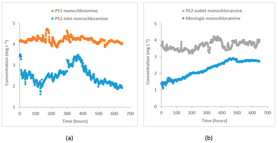 Observed monochloramine time–series at (a) PS1 and PS2 inlet and (b) PS2 outlet after re–chlorination and at Meningie.