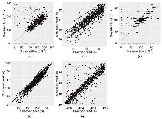 Plot of observed vs. model–simulated values using EPANET. (a) Flow at PS1, (b) head at Coomandook tank, (c) flow at PS2, (d) head at Binnies tank, and (e) head at Meningie tank.