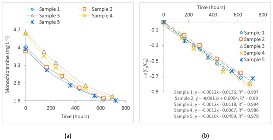 (a) Plot of the observed monochloramine decay for the experimented samples and (b) first–order curve fitting for these samples. represents initial monochloramine concentration, while represents monochloramine concentration at time t.