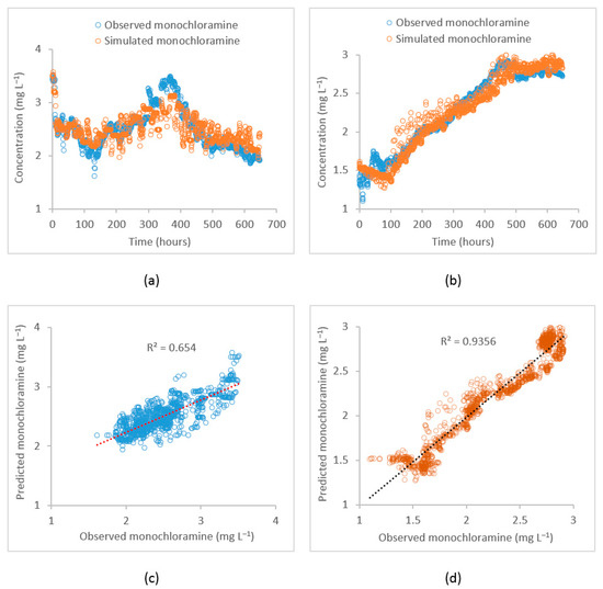 Observed data from the selected locations were used to calibrate the EPANET water quality model. The parameters representing bulk and wall decays, tank reaction rates, and initial monochloramine residual concentrations were included in the calibration process. The initial monochloramine concentration can be gradually reduced as the distance from the source increases because of residual decay. Therefore, the whole distribution system is arbitrarily divided into several zones and for each zone, individual initial concentrations were assigned which were also calibrated. The calibrated value of the first-order bulk decay coefficient for the flow path from PS1 to the PS2 inlet (path 1) was −0.0012 while for the PS2 outlet to Meningie (path 2) was −0.001 . For path 2, the calibrated bulk decay coefficient was relatively low as compared to that for path 1. This is because the monochloramine bulk decay rate decreased with the increased water age. Similarly, this variation can also be attributed to varying pH and temperature throughout the system. In contrast, the calibrated first-order wall decay coefficient for path 1 was −0.029 m while path 2 was −0.006 m . For path 1, most pipe diameters varied from 610 mm to 758 mm while for path 2, most pipe diameters ranged between 102 mm to 363 mm. The calibrated wall decay coefficients represent average values for the whole path. The fit between the observed and the simulated monochloramine residual concentration as obtained through the calibrated model was measured by the Root Mean Square Error (RMSE) and coefficient of determination (R2). Figure 5 shows the observed and the simulated monochloramine concentration plots at the PS2 inlet and Meningie and corresponding correlation plots for these locations. At the PS2 inlet, the calibration performance in terms of RMSE and R2 were 0.007 and 0.66, respectively, while at Meningie, the performances were 0.009 and 0.94. The model’s performance at the PS2 inlet was relatively poor as compared to that at Meningie, which can be attributed to many factors including pH and temperature changes and the quality of the observed data used in model calibration.