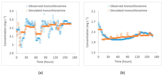 Time–series plot of observed vs. simulated monochloramine concentrations by the EPANET model during the validation period at (a) the PS2 inlet and (b) Meningie.
