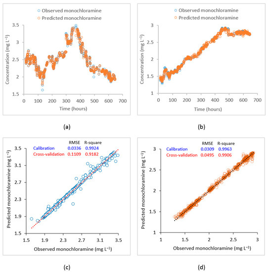 Plot of observed vs. SVR predicted monochloramine concentrations. (a) Time–series at PS2, (b) time–series at Meningie, (c) correlation plot at the PS2 inlet, and (d) correlation plot at Meningie.