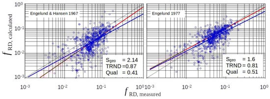 In the following, the accuracy for the friction coefficient was separately determined in the case of ripples and for all data (ripples and dunes). This is due to the fact that the measured values of and bed inclination I are generally more accurate for ripple beds than for dunes, especially if they come from measurements in the laboratory, as is mostly the case here: