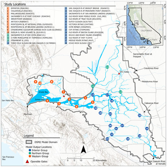 Schematic showing the Sacramento–San Joaquin Delta (Delta), the 28 study locations in three groups, and the model domain of the DSM2 model. The insert map illustrates the location of the Delta in the State of California, United States.