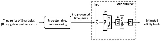 MLP networks have demonstrated success in salinity modeling in the Delta [17,19,20,21,23]. In the current study, we use the same MLP network architecture as proposed in [19], which consists of an input layer, two fully connected (FC) hidden layers with eight and two neurons, respectively, and an output layer with one neuron. Further, we apply the MTL strategy as in [23] and expand the scope of the salinity modeling task from 12 salinity stations to 28 stations in the Delta. The detailed model architecture is given in Figure 2. Additionally, the same pre-processing method utilized in [19,23] is adopted for input dimension reduction in the current study.