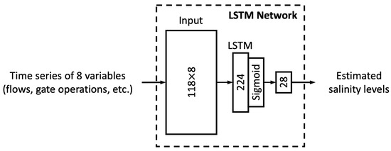The recurrent neural network (RNN) is a type of ANN model well suited for handling sequential data, such as the time series data in salinity modeling [30,31,32,33]. An LSTM network [34] is a special type of RNN that has been widely used in time series estimation [33,35,36], and has recently been applied to estimate salinity at one location in the Delta [22]. Inside the LSTM layer, there is an input gate, a forget gate, and an output gate. In comparison with common RNN layers, the LSTM layer stores a cell state vector and can maintain, update, or erase it when recurrently processing the input vector. A detailed diagram of an LSTM layer is provided in Figure A1 in Appendix B. To ensure a fair comparison with the MLP model in Section 2.3.1, we propose the LSTM network architecture depicted in Figure 3, which consists of an input layer, an LSTM layer with 224 units, and an output layer with 28 neurons. As the LSTM layer is naturally designed to capture the sequence dependence in the input time series, the pre-defined input data pre-processing can be skipped.
