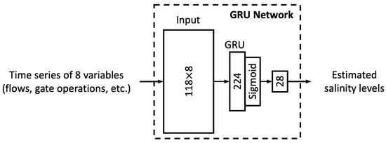 As RNNs are commonly used for time series estimation, other than the LSTM units with three gates, we further explore the less complex Gated Recurrent Unit (GRU) architecture, which is another type of RNN [37] that has less structural complexity than the LSTM network. A GRU consists of only two gates, a reset gate and an update gate, and does not have an internal memory unit as LSTM does. Similar to LSTM units, GRUs are also developed for processing long sequences and are thus suitable for salinity estimation in this work. We design the GRU-based RNN architecture as shown in Figure 4, which includes an input layer, a GRU layer with the same number of units as the LSTM architecture in Figure 3, and an output layer.