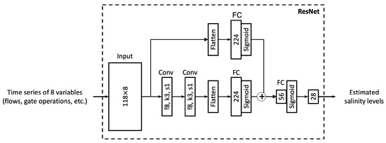 ANNs have been extensively applied in water resource modeling, of which the conventional multi-layer perceptron (MLP) networks are probably the most popular networks being explored [28]. Recently, deep-learning approaches have gained increasing attention and seen more applications in the field of water resources [29]. In this work, we first follow the study of Qi et al. [23] and examine the applicability of the traditional MLP networks as our benchmark in emulating DSM2 in salinity modeling. Next, following the work of He et al. [22], we develop a deep-learning architecture: the Long-Short-Term Memory (LSTM) network for the emulation task and compare its performance against that of the MLP networks. Finally, as a proof-of-concept exploration, we examine two additional deep-learning architectures, the Gated Recurrent Units (GRUs) and the Residual Networks (ResNets), that have never been applied in salinity modeling before, to our best knowledge. The goal of this final exploration is to assess the capability of less complex, and thus less prone to overfitting (than LSTM), deep-learning architectures in emulating DSM2 for salinity simulation. All these architectures are implemented in the form of multi-task learning (one single network for all study locations). They are briefly described as follows.