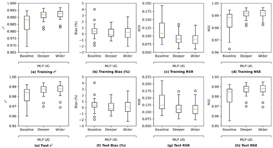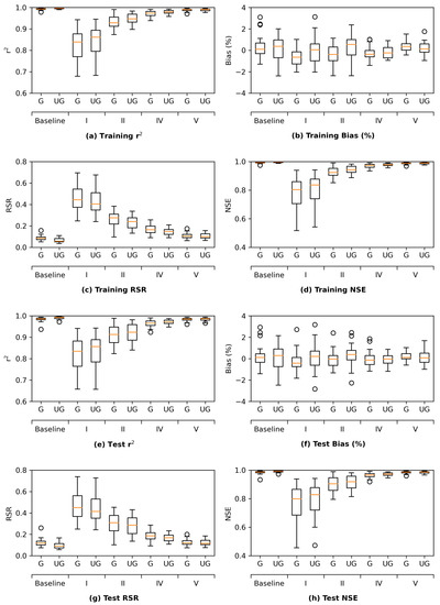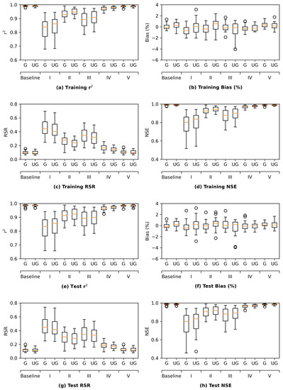 Box and whisker plots of four types of metrics consisting of r2, percent bias, RSR, and NSE during the training (panels (a–d)) and test (panels (e–h)) phases of the grouped (G) and ungrouped (UG) MLP models under six scenarios: baseline and five different memory lengths as presented in Table 1. For a specific plot, the orange line represents the median value of the 28 metrics corresponding to 28 study locations; the box containing the orange line is the interquartile range from the 25th percentile up to the 75th percentile. The top bar designates the maximum metric value within 1.5 times the interquartile range above the 75th per percentile, while the bottom bar represents the minimum metric values within 1.5 times the interquartile range below the 25th percentile. The open circles designate outliers.