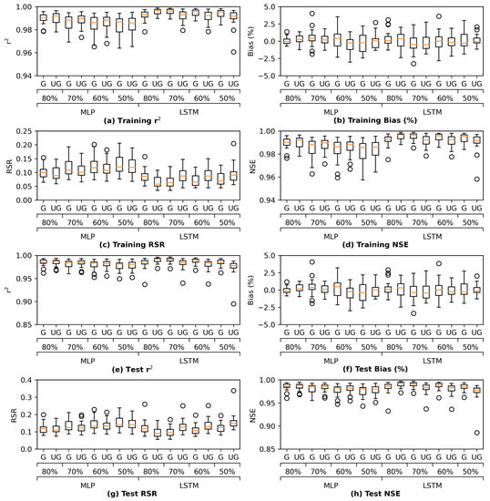 Box and whisker plots of four types of metrics consisting of , percent bias, RSR, and NSE during the training (panels (a–d)) and test (panels (e–h)) phases of the grouped (G) as well as ungrouped (UG) MLP and LSTM models under four scenarios with varying lengths of training data: 50%, 60%, 70%, and 80% of all the data available.