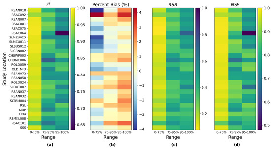 Model (grouped LSTM) performance measured by (a) , (b) Percent Bias, (c) RSR, and (d) NSE at different salinity ranges: low-middle range (lowest 75%), high range (75 to 95 percentile, and extremely high range (highest 5%) at the study locations.